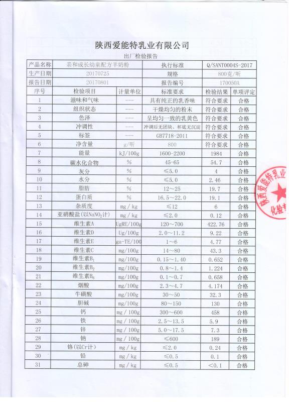 亲和成长幼童配方羊奶粉800克2017年7月25日检验报告