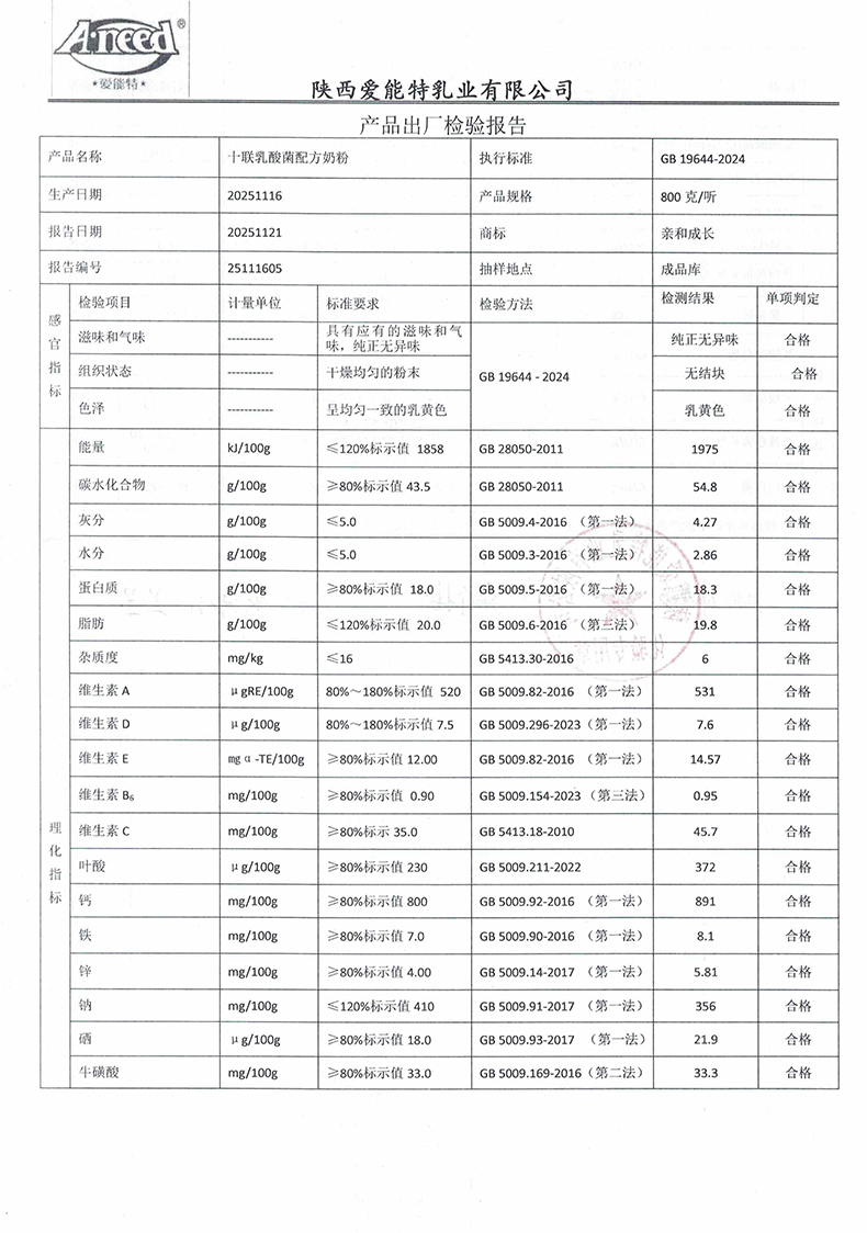 亲和成长十联乳酸菌配方奶粉800克2025年11月16日检验报告