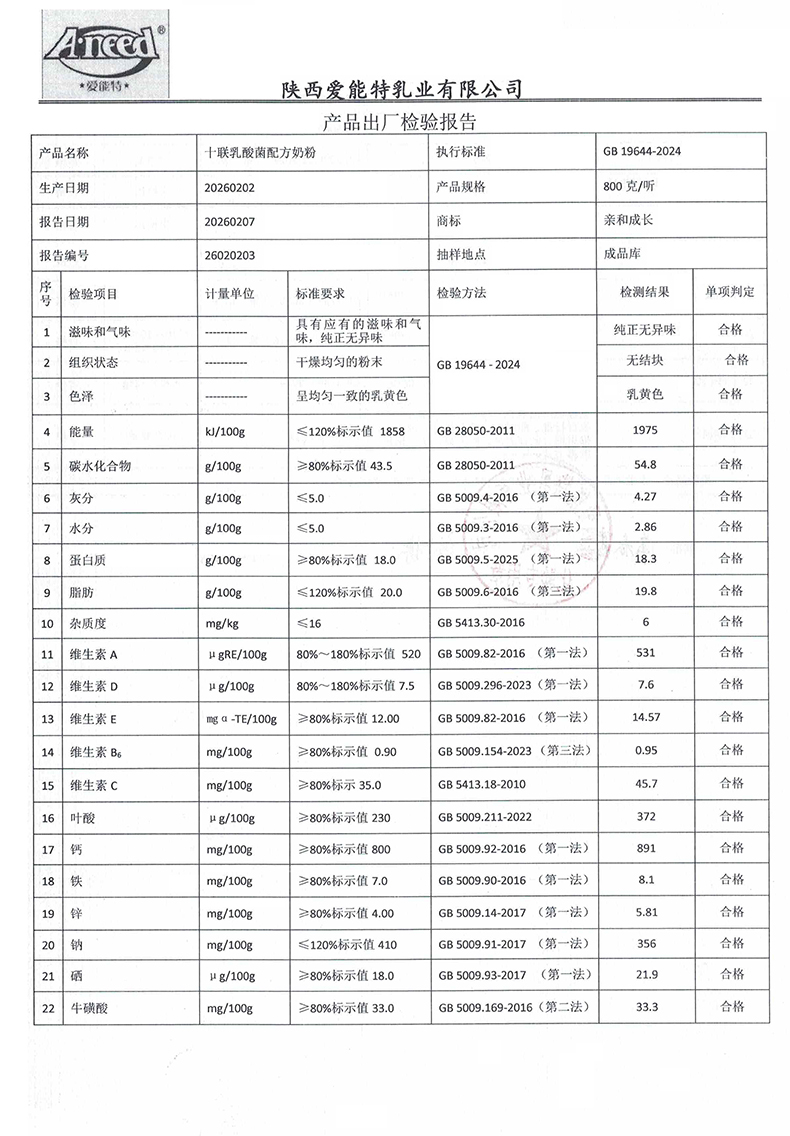 亲和成长十联乳酸菌配方奶粉800克2026年02月02日检验报告