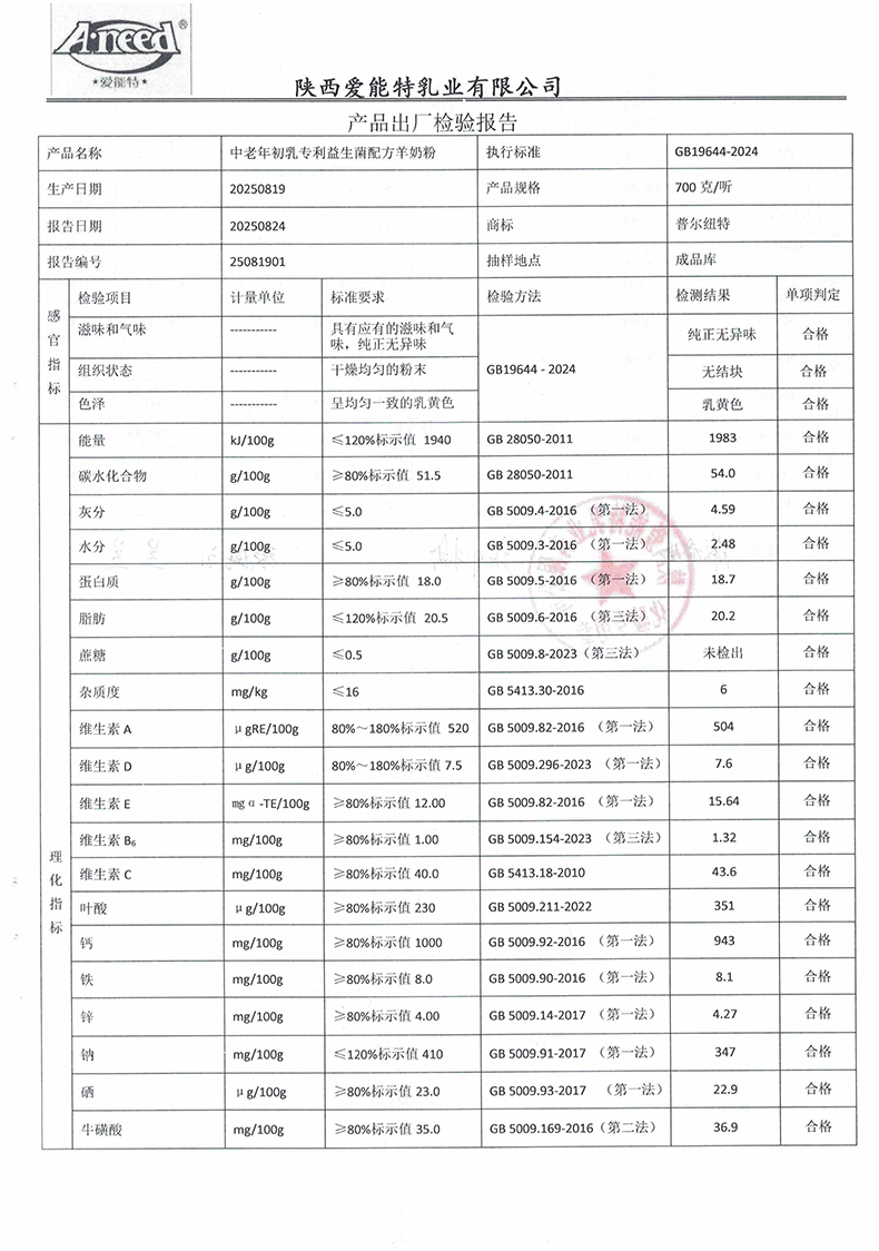 普尔纽特中老年初乳专利益生菌配方羊奶粉700克2025年8月19日检验报告