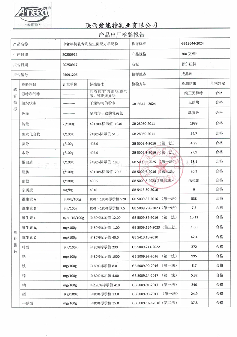 普尔纽特中老年初乳专利益生菌配方羊奶粉700克2025年9月12日检验报告