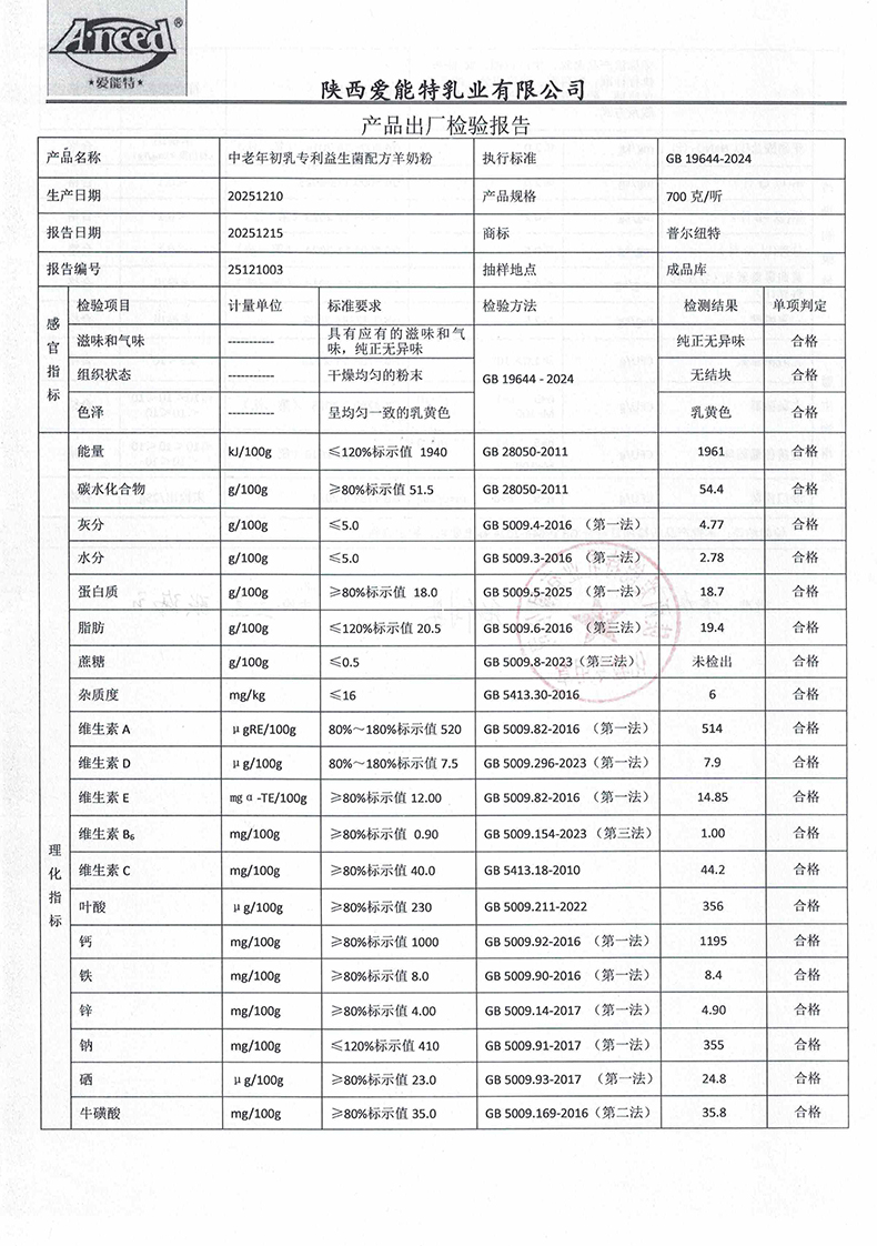 普尔纽特中老年初乳专利益生菌配方羊奶粉700克2025年12月10日检验报告