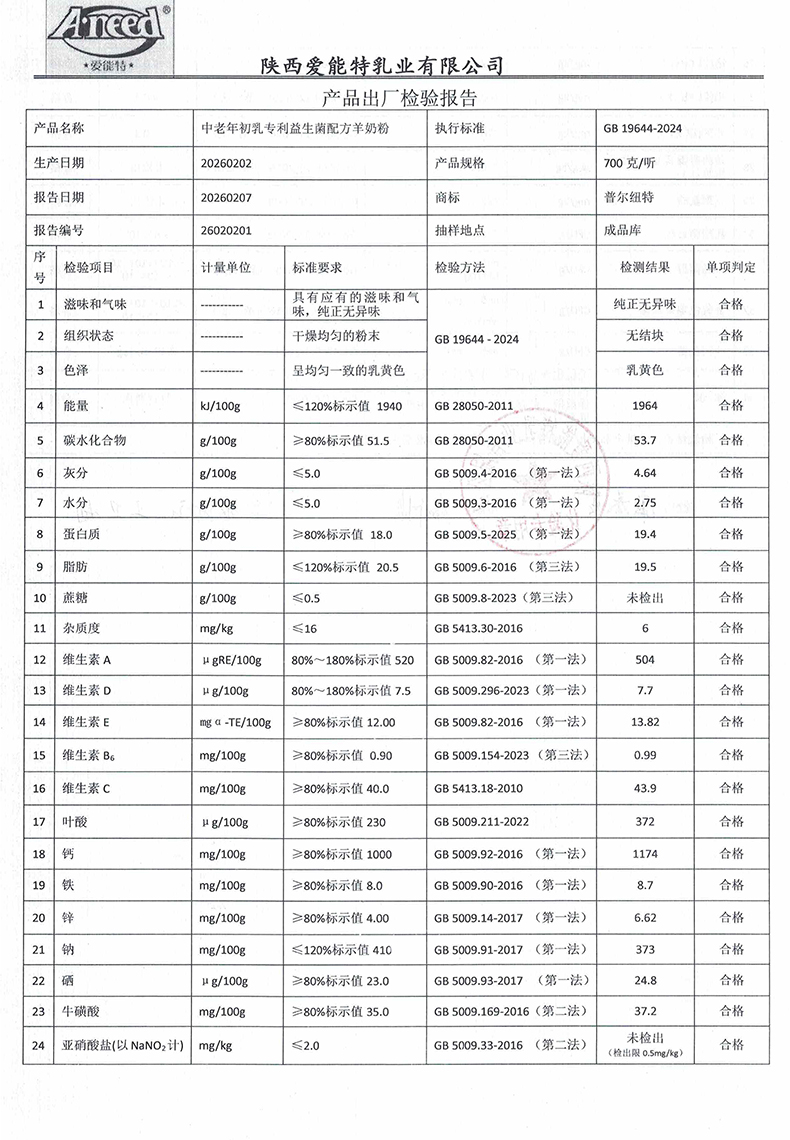 普尔纽特中老年初乳专利益生菌配方羊奶粉700克2026年02月02日检验报告