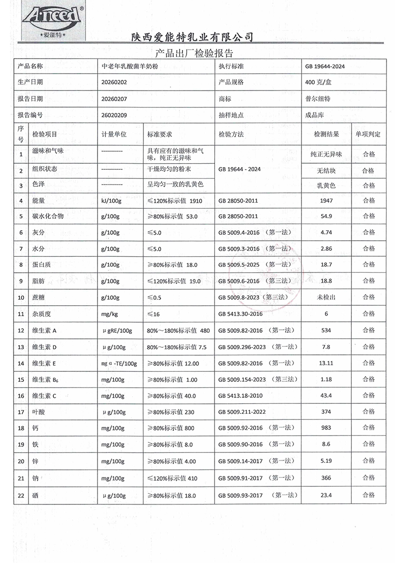 普尔纽特中老年乳酸菌羊奶粉400克2026年02月02日检验报告