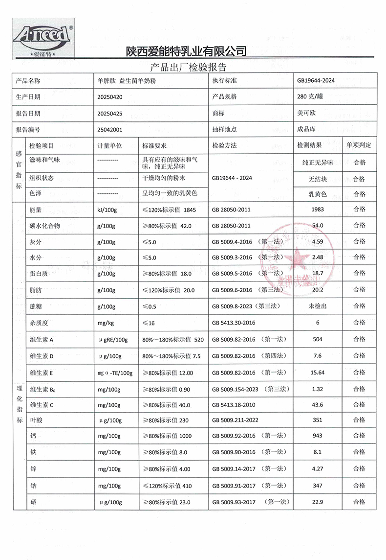 美可欧羊脾肽益生菌羊奶粉280克2025年4月20日检验报告