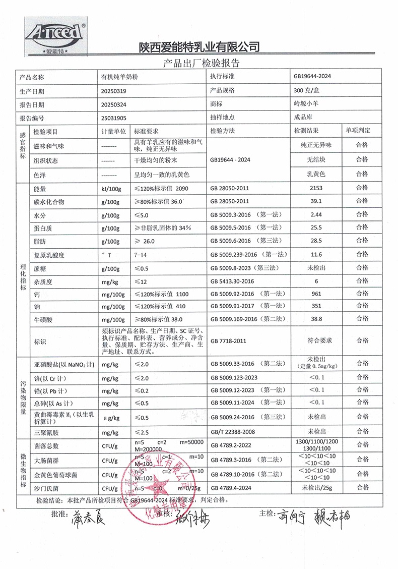 岭塬小羊有机纯羊奶粉300克2025年3月19日检验报告