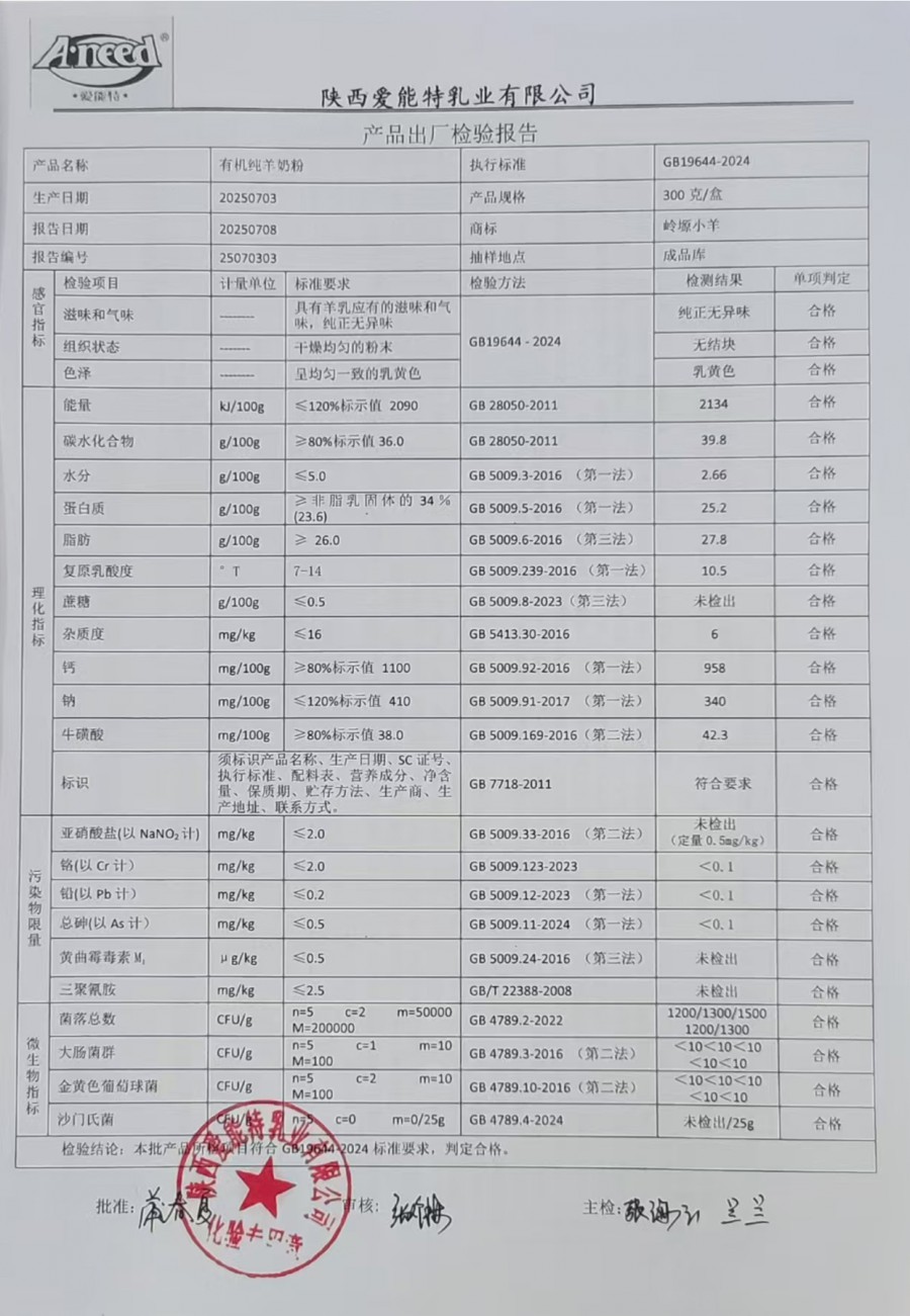 岭塬小羊有机纯羊奶粉300克2025年7月3日检验报告