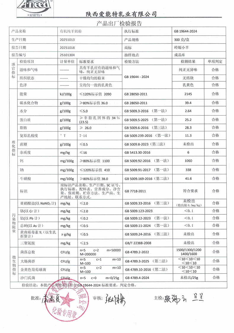岭塬小羊有机纯羊奶粉300克2025年10月13日检验报告