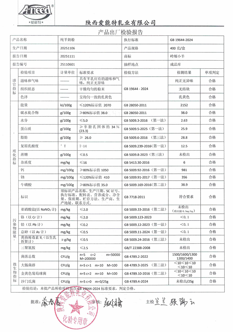 岭塬小羊纯羊奶粉400克2025年11月6日检验报告