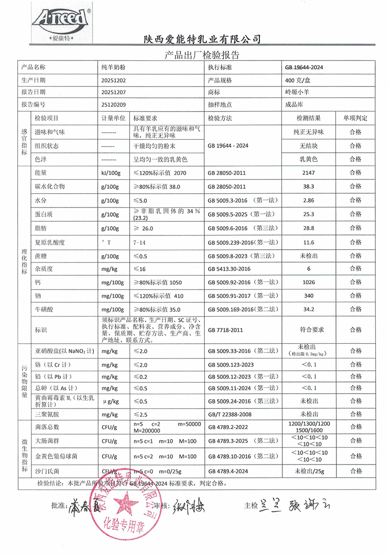 岭塬小羊纯羊奶粉400克2025年12月2日检验报告