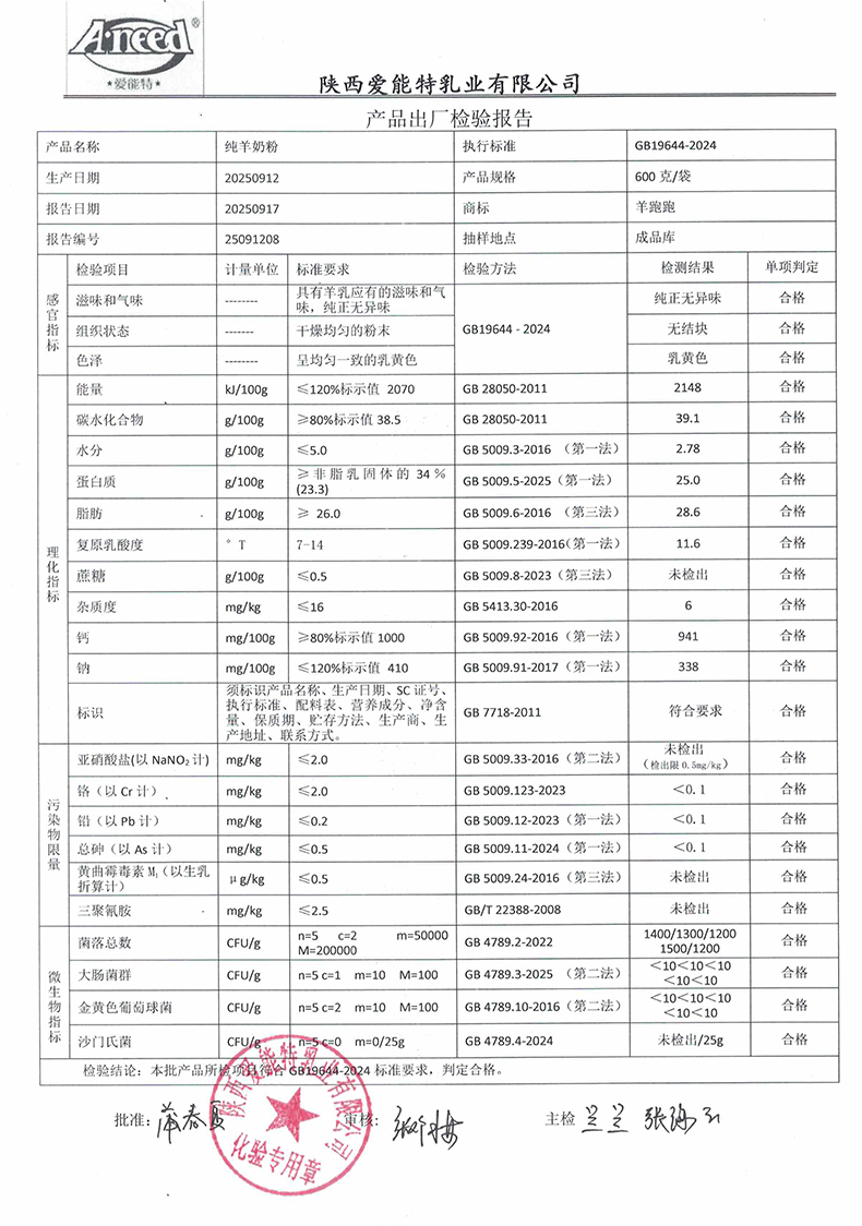 羊跑跑纯羊奶粉600克2025年9月12日检验报告