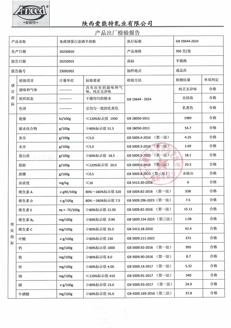 羊跑跑免疫球蛋白富硒羊奶粉360克2025年9月20日检验报告