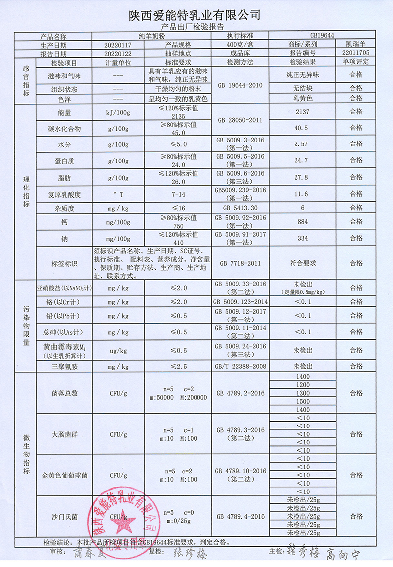 凯瑞羊纯羊奶粉400克2022年1月17日检验报告