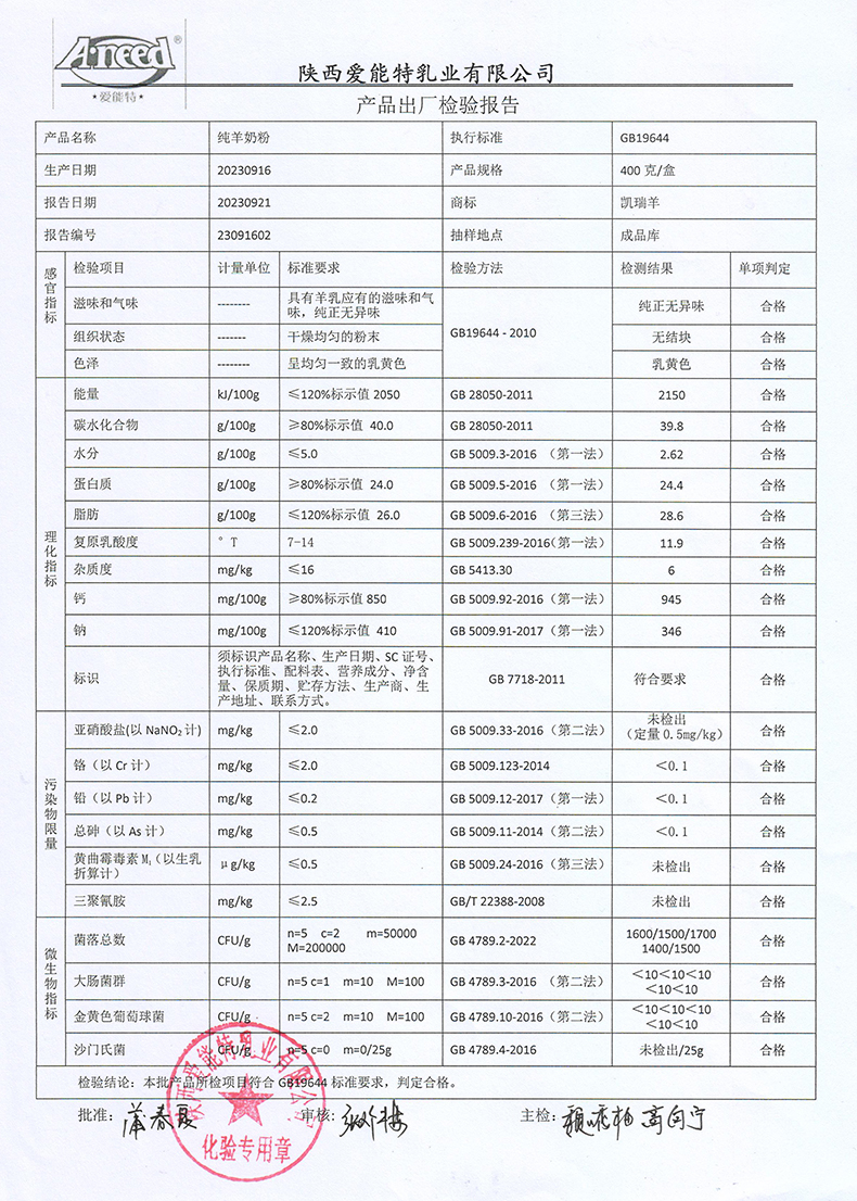 [下一页] 凯瑞羊初乳羊奶粉800克2023年9月20日检验报告