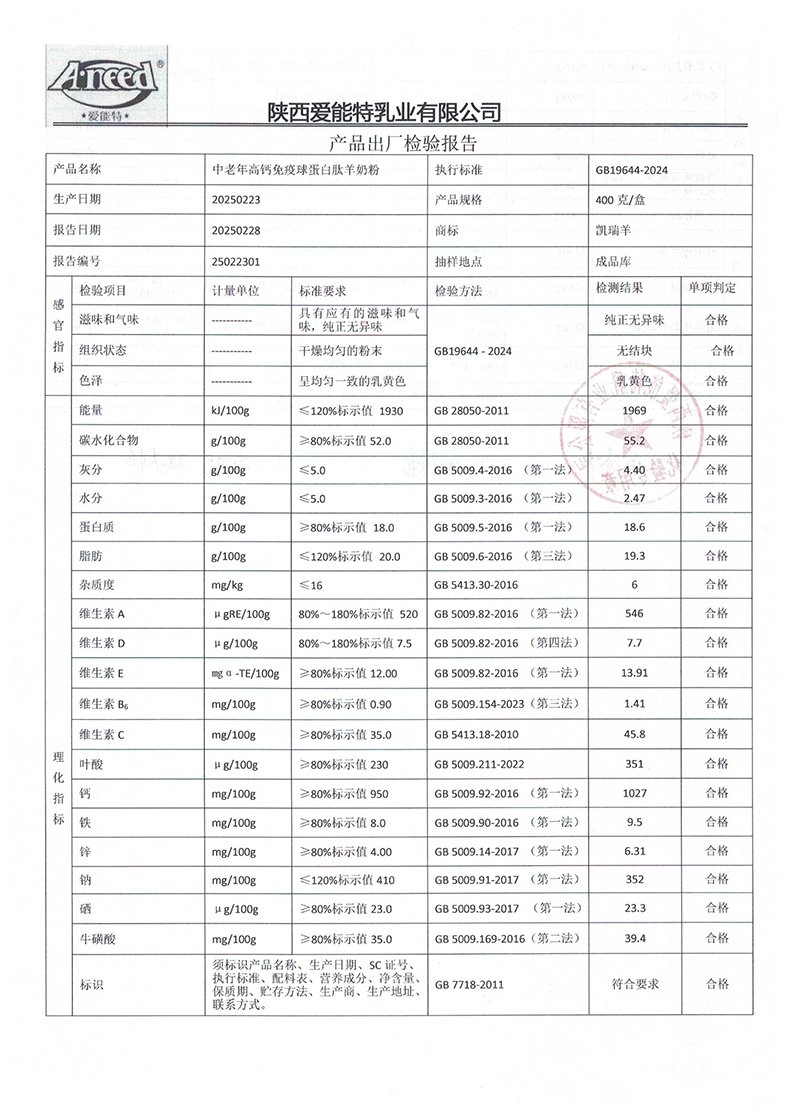 凯瑞羊中老年高钙免疫球蛋白肽羊奶粉400克2025年2月23日检验报告