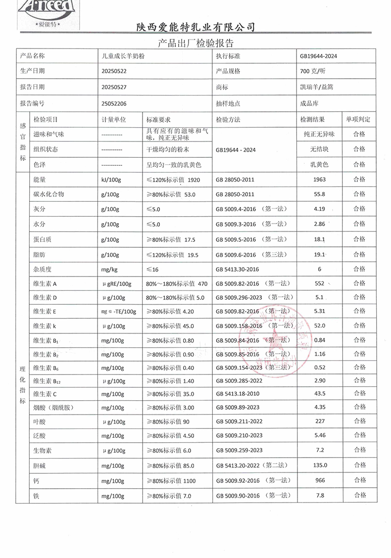 凯瑞羊益篙儿童成长羊奶粉700克2025年5月22日检验报告