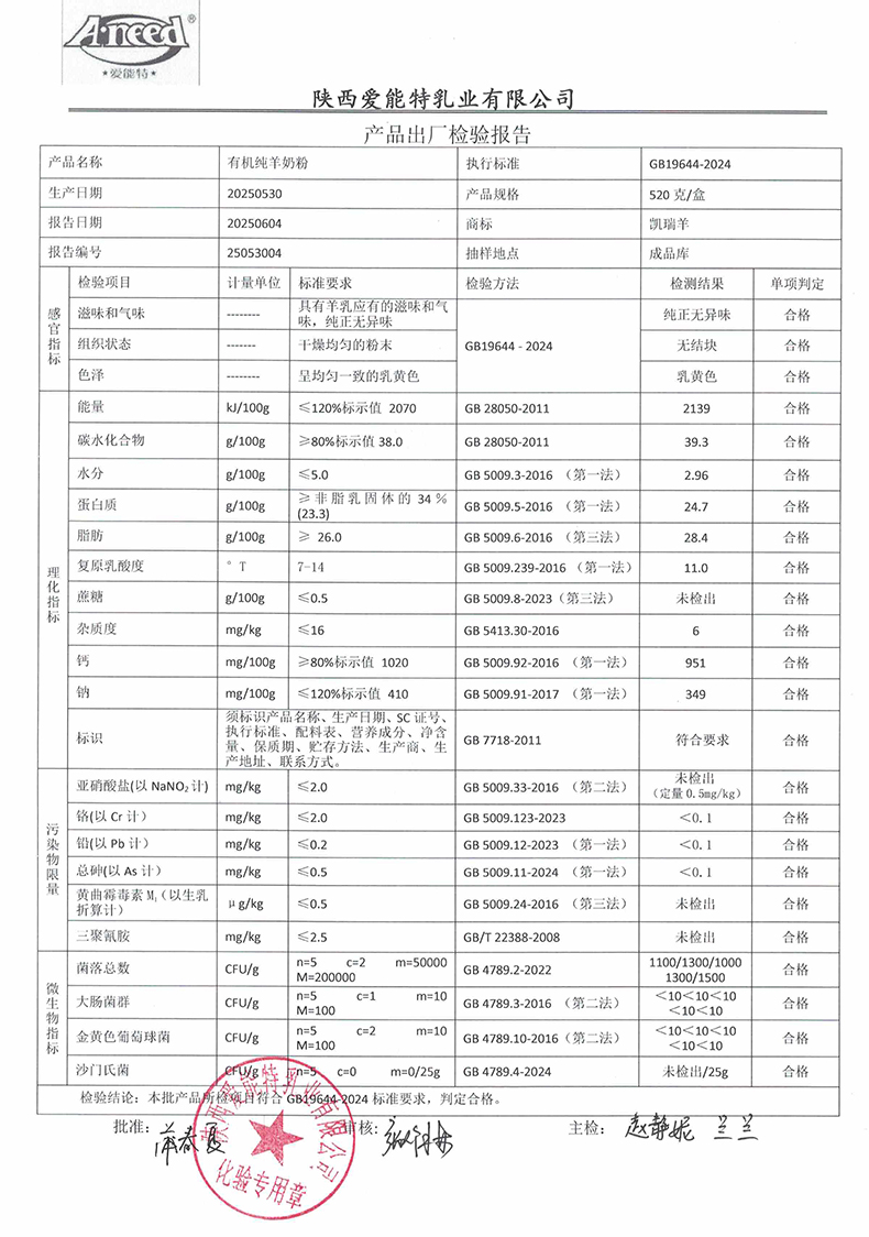 [下一页] 凯瑞羊有机纯羊奶粉380克2025年5月30日检验报告