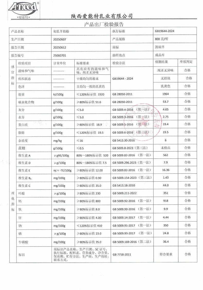 凯瑞羊初乳羊奶粉800克2025年6月7日检验报告