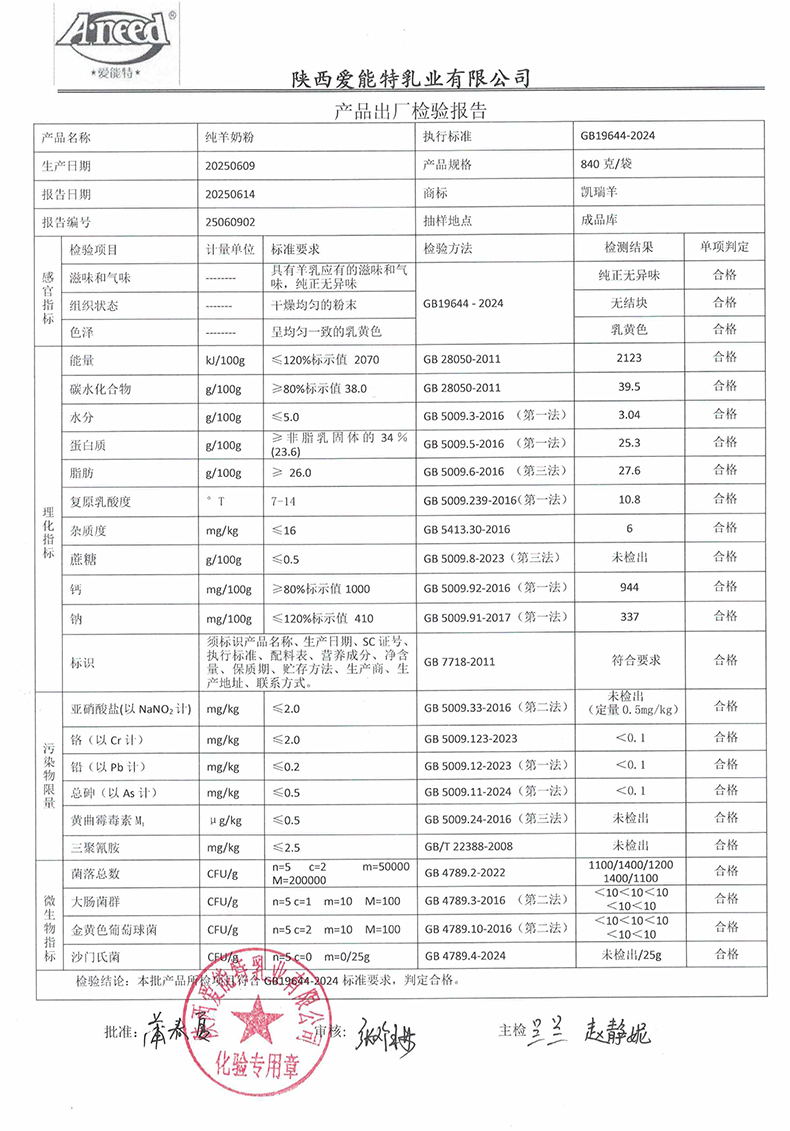 凯瑞羊纯羊奶粉840克2025年6月9日检验报告