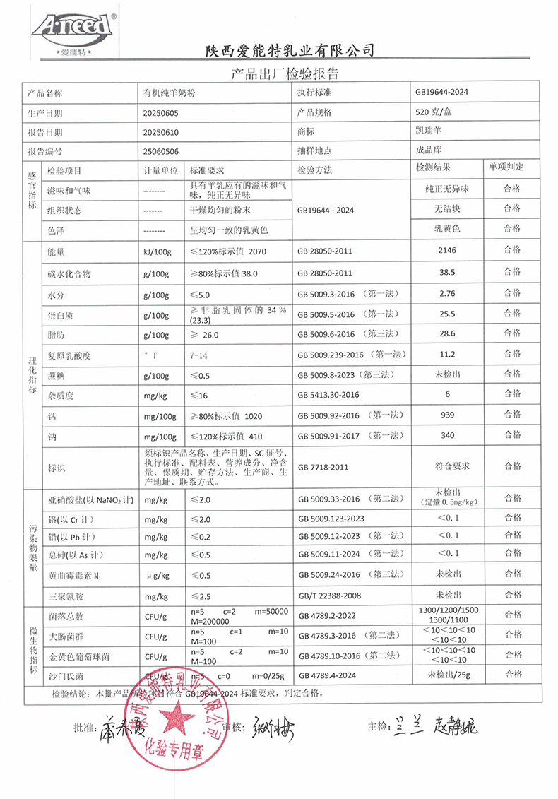 凯瑞羊有机纯羊奶粉520克2025年6月5日检验报告