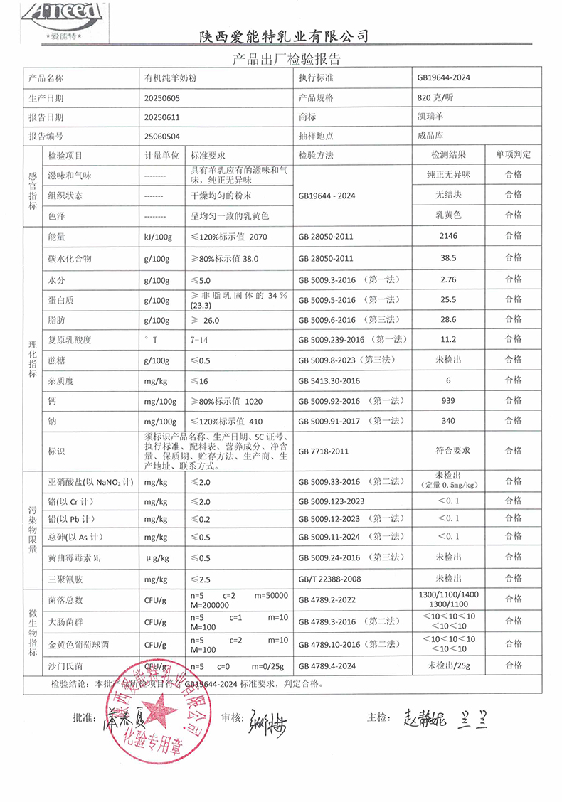 凯瑞羊有机纯羊奶粉820克2025年6月5日检验报告