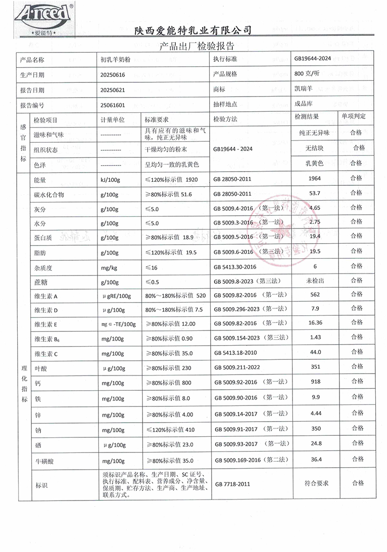 凯瑞羊初乳羊奶粉800克2025年6月16日检验报告