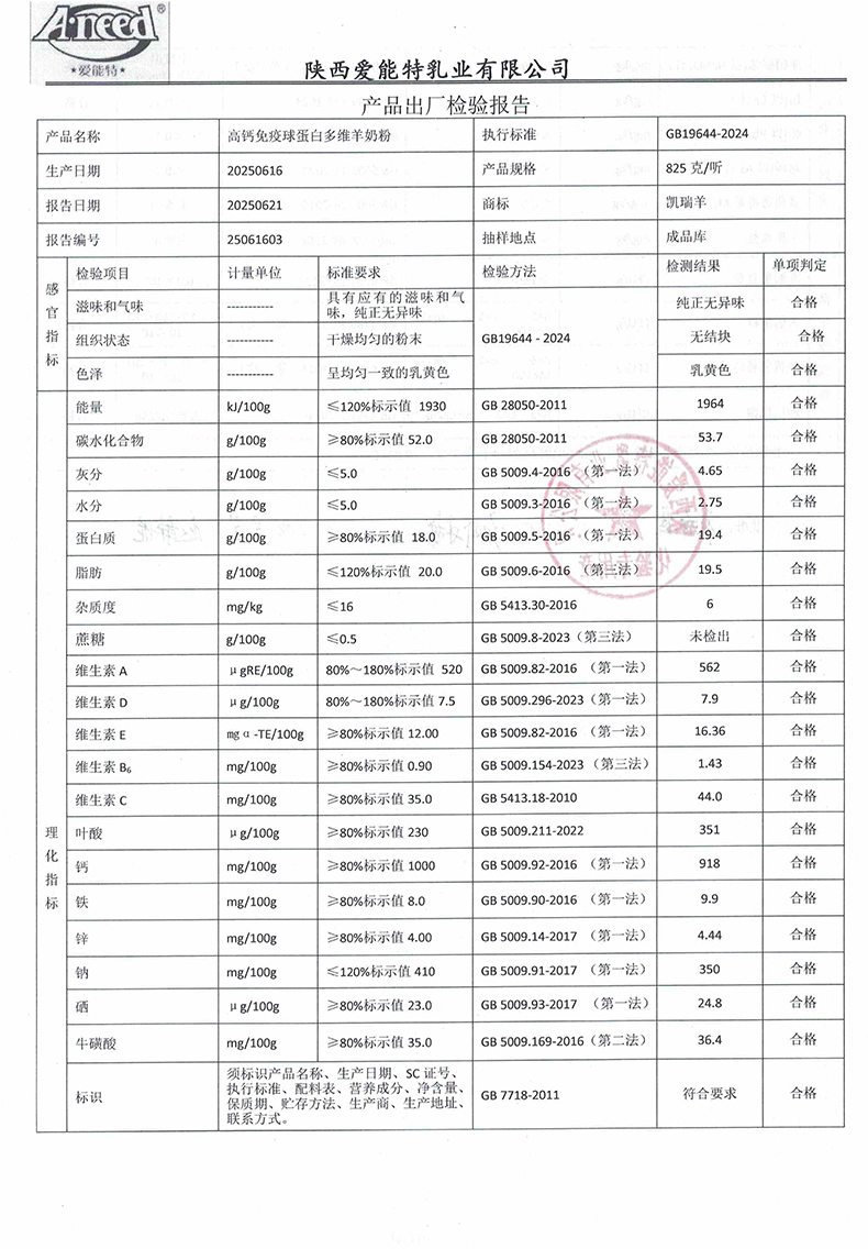 凯瑞羊高钙免疫球蛋白多维羊奶粉825克2025年6月16日检验报告