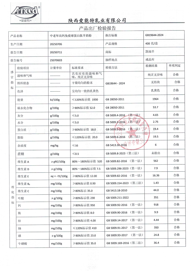 凯瑞羊中老年高钙免疫球蛋白肽羊奶粉400克2025年7月6日检验报告