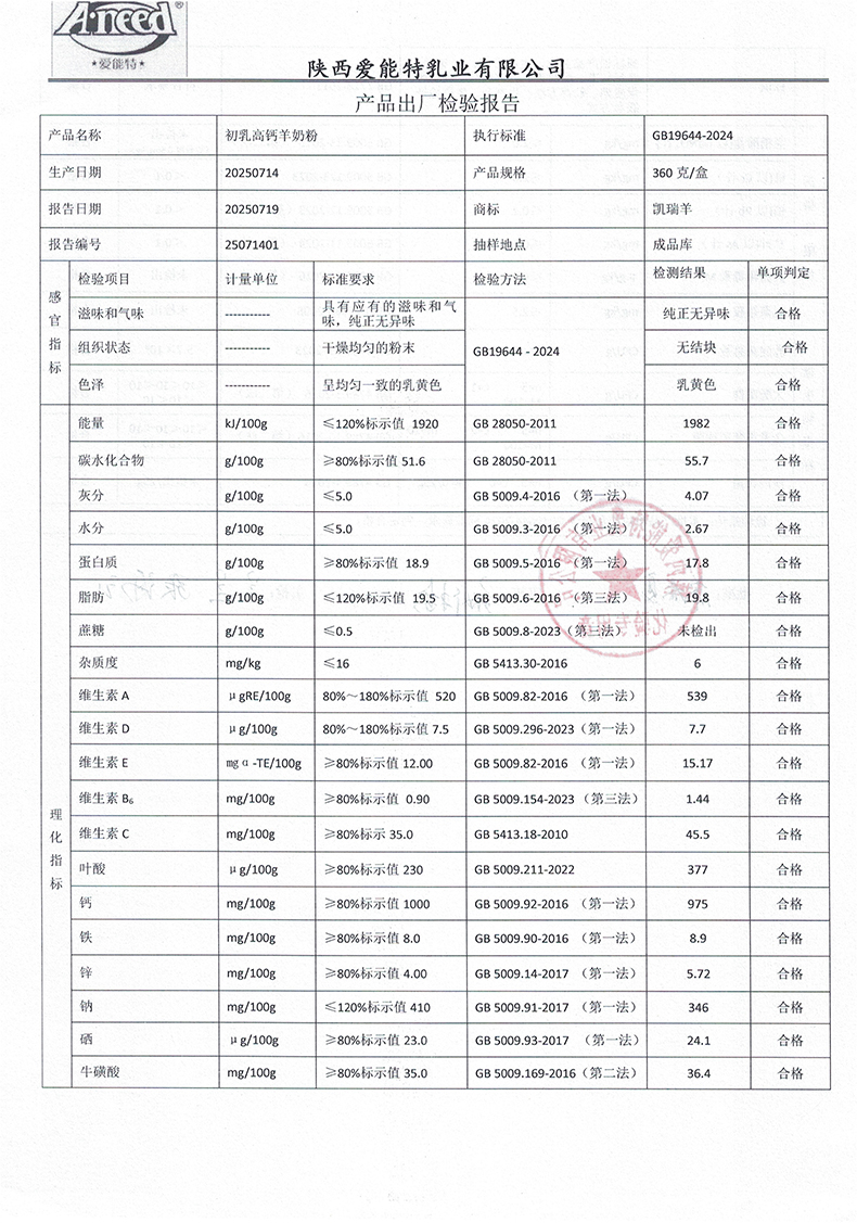 凯瑞羊初乳高钙羊奶粉360克2025年7月14日检验报告