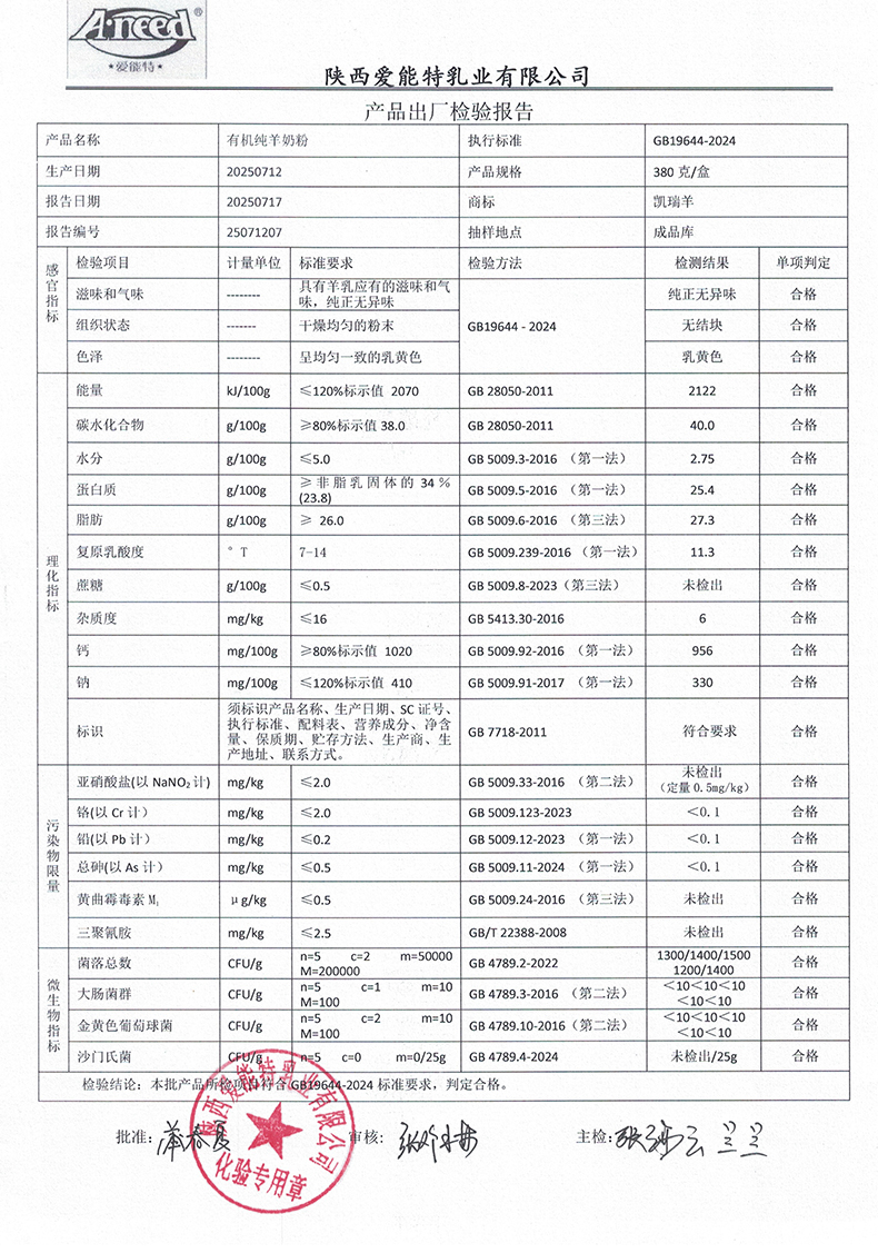 凯瑞羊有机纯羊奶粉380克2025年7月12日检验报告