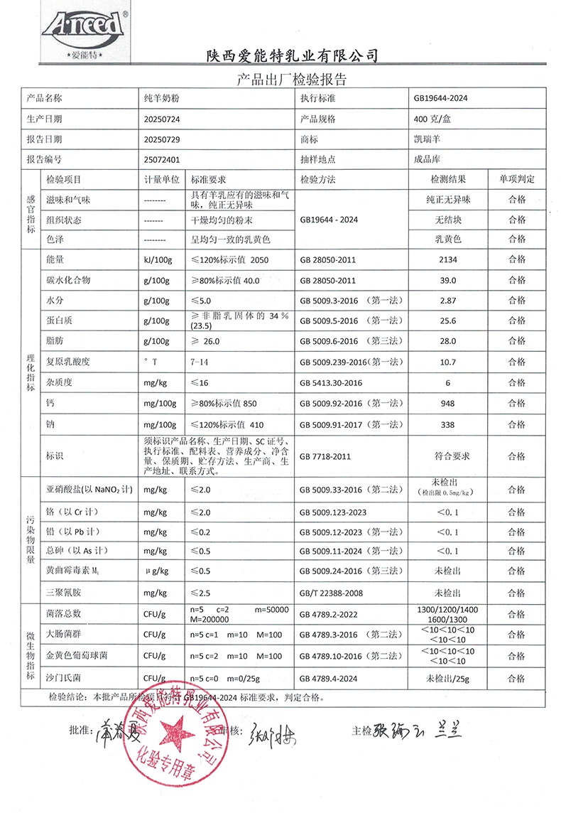 凯瑞羊纯羊奶粉400克2025年7月24日检验报告