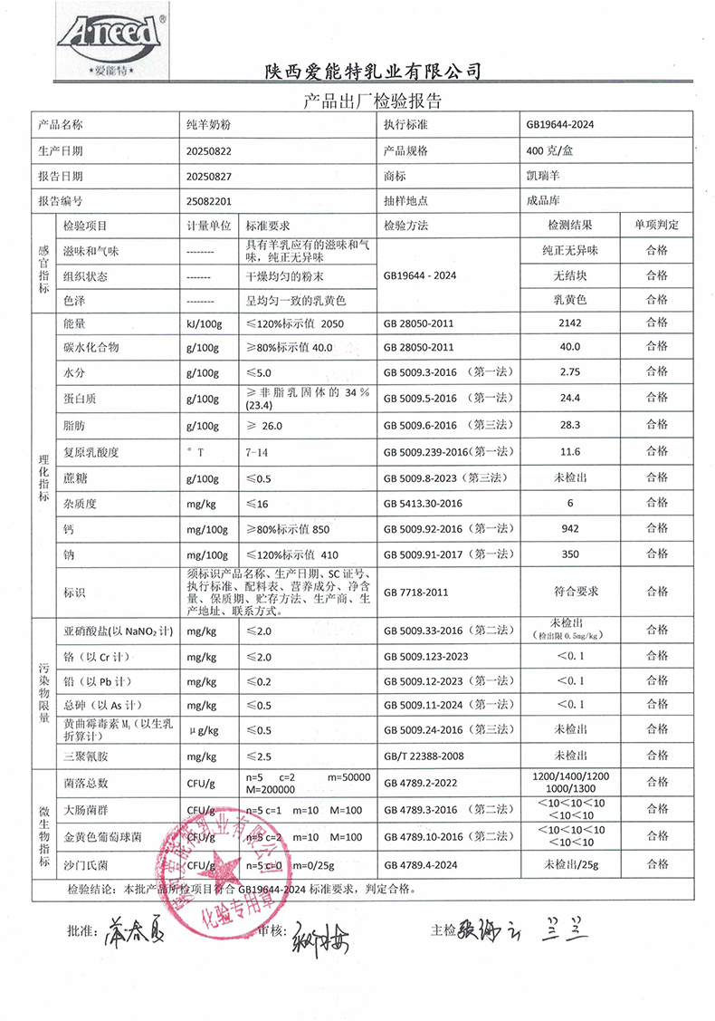凯瑞羊纯羊奶粉400克2025年8月22日检验报告