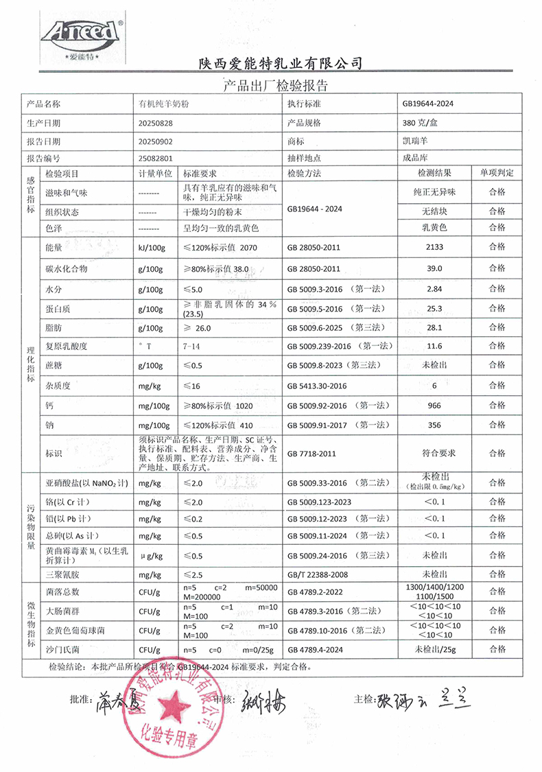 凯瑞羊有机纯羊奶粉380克2025年8月28日检验报告