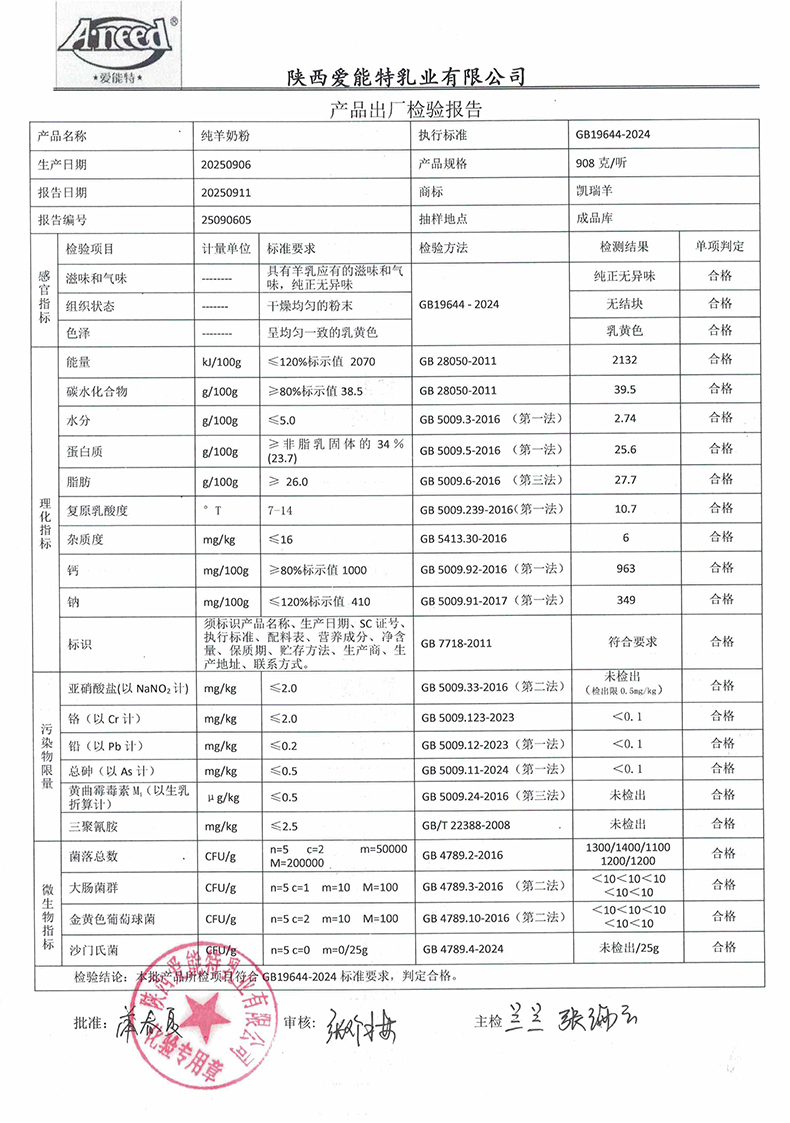 凯瑞羊纯羊奶粉908克2025年9月6日检验报告