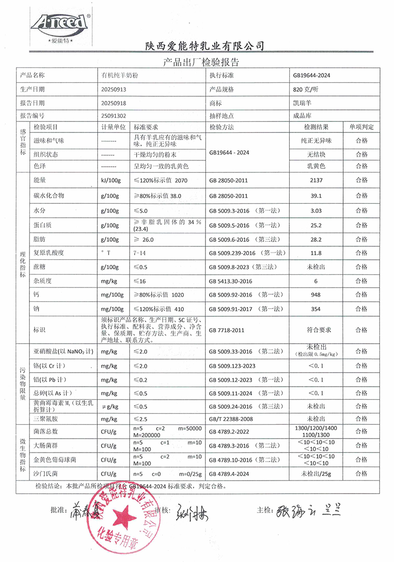 凯瑞羊有机纯羊奶粉820克2025年9月13日检验报告
