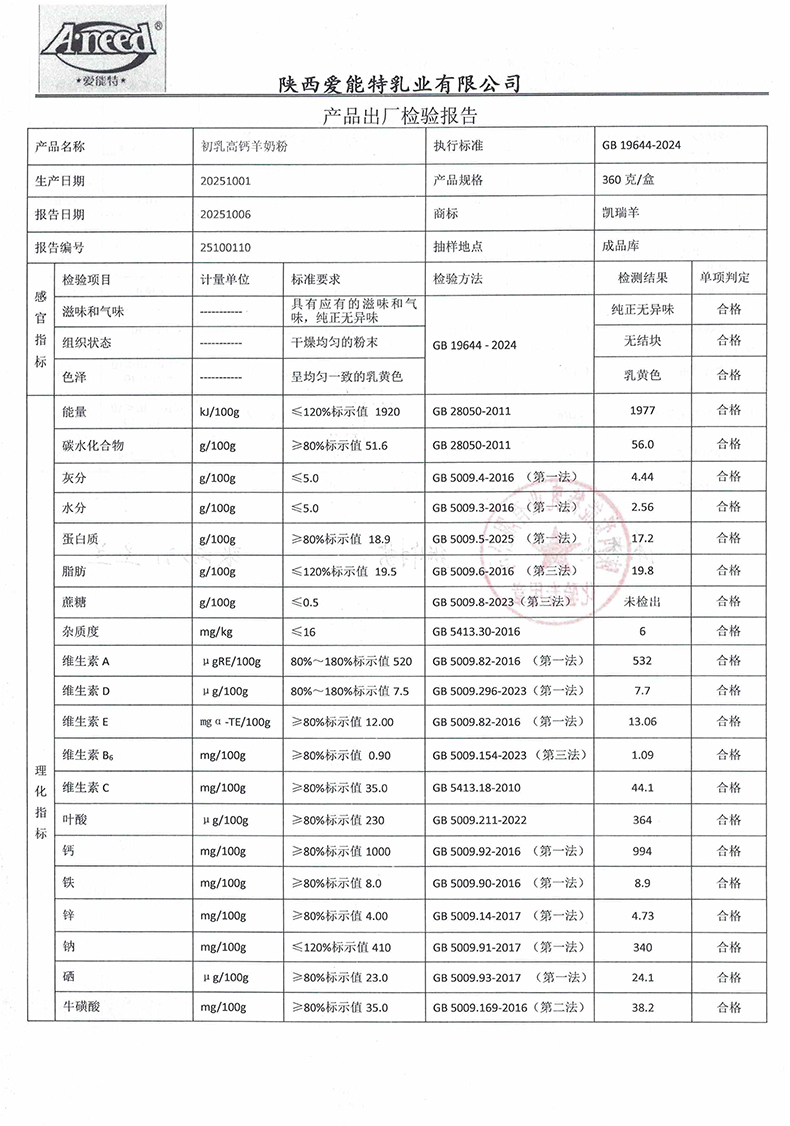 凯瑞羊初乳高钙羊奶粉360克2025年10月1日检验报告