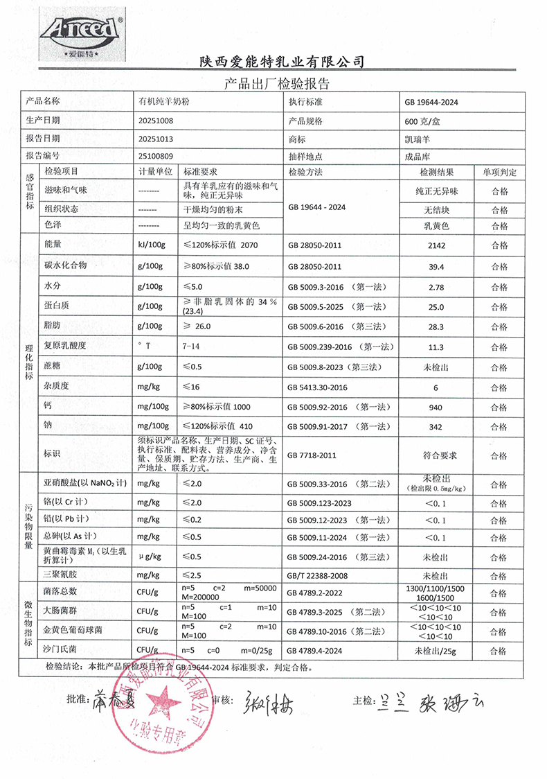 凯瑞羊有机纯羊奶粉600克2025年10月8日检验报告