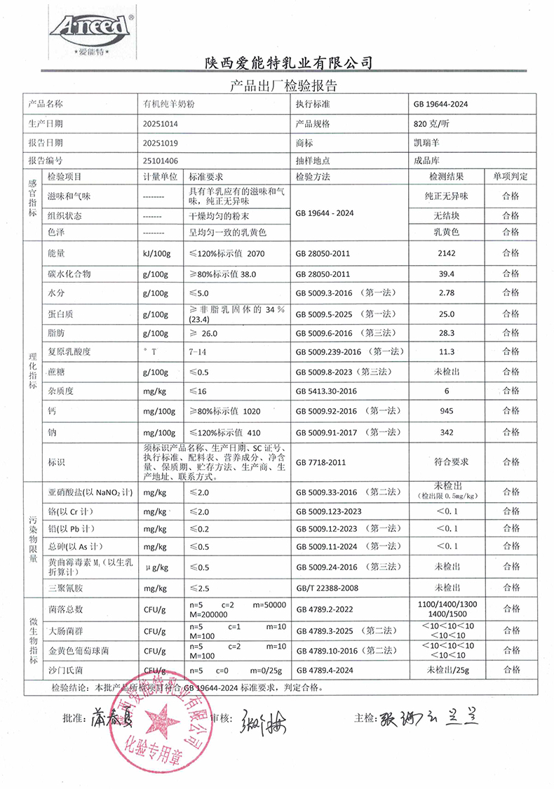 凯瑞羊有机纯羊奶粉820克2025年10月14日检验报告