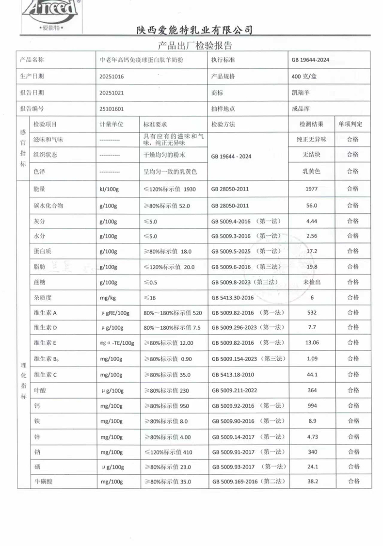 凯瑞羊中老年高钙免疫球蛋白肽羊奶粉400克2025年10月16日检验报告