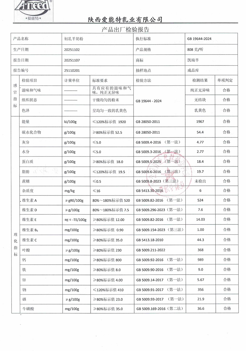 凯瑞羊初乳羊奶粉808克2025年11月02日检验报告