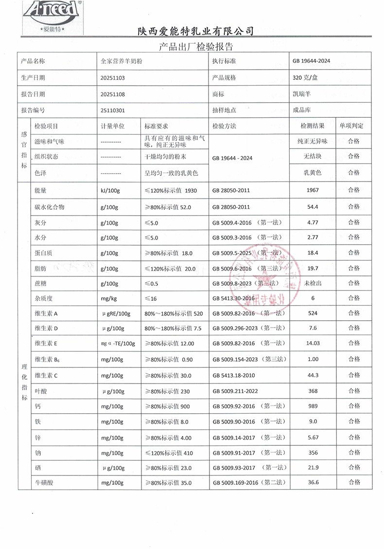 凯瑞羊全家营养羊奶粉320克2025年11月03日检验报告