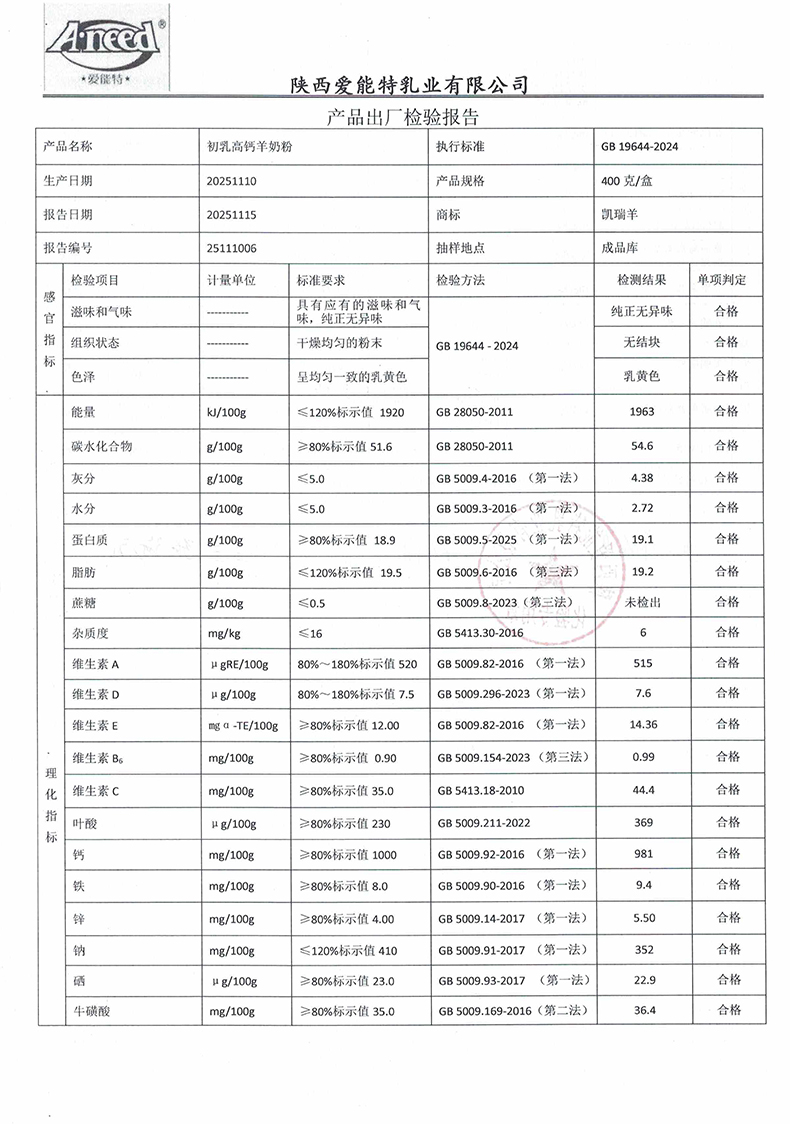 凯瑞羊初乳高钙羊奶粉400克2025年11月10日检验报告