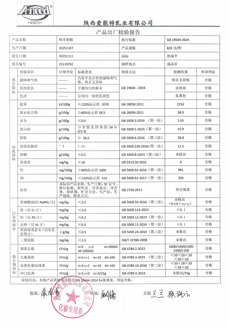 凯瑞羊纯羊奶粉825克2025年11月7日检验报告