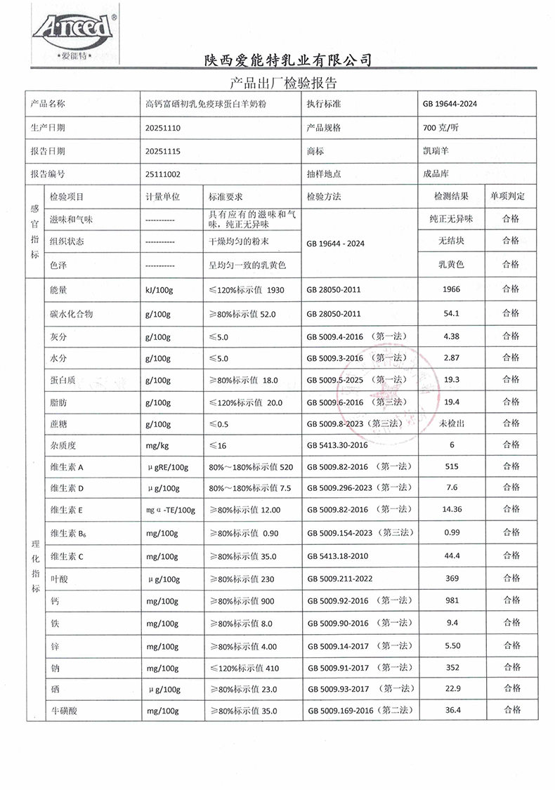 凯瑞羊高钙富硒初乳免疫球蛋白羊奶粉700克2025年11月10日检验报告