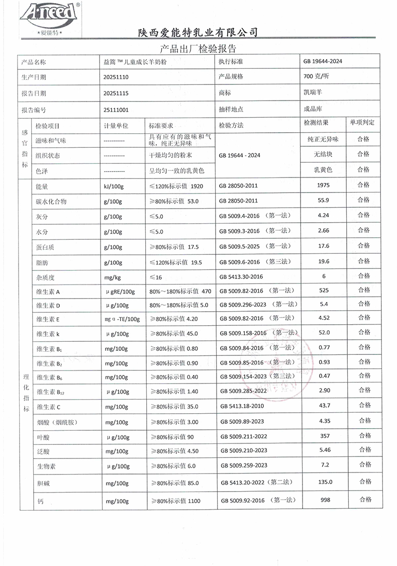 凯瑞羊益篙儿童成长羊奶粉700克2025年11月10日检验报告