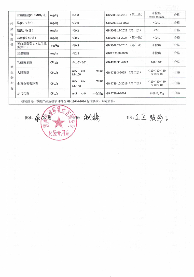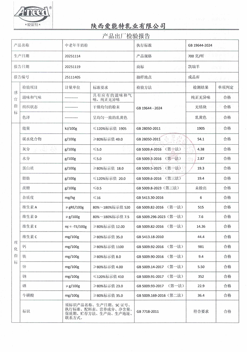 凯瑞羊中老年羊奶粉700克2025年11月14日检验报告
