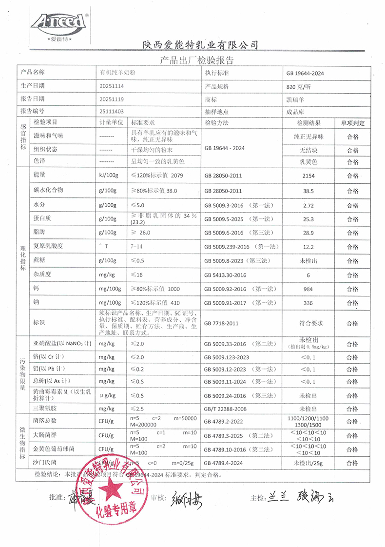 凯瑞羊有机纯羊奶粉820克2025年11月14日检验报告
