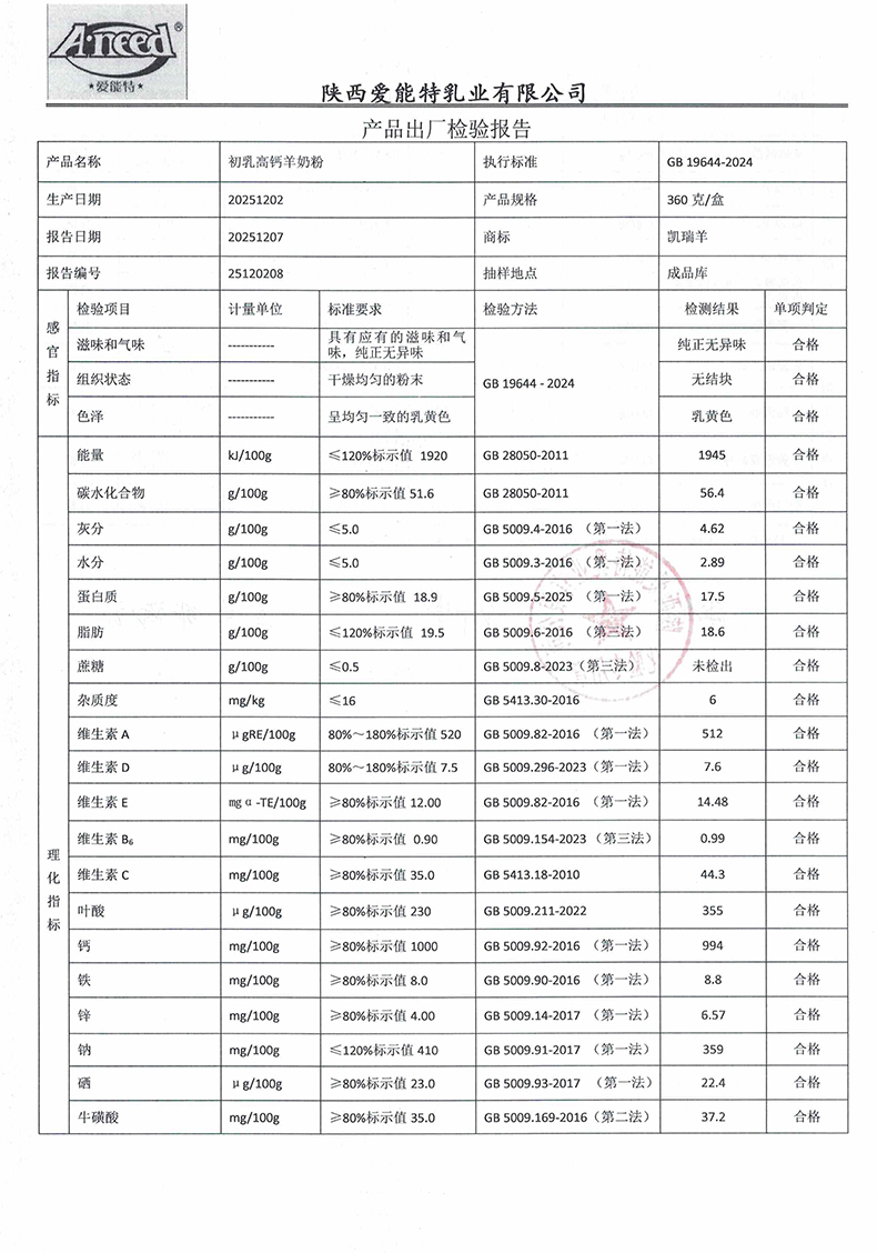 凯瑞羊初乳高钙羊奶粉360克2025年12月2日检验报告