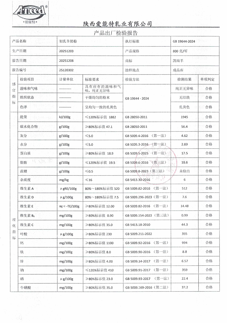 凯瑞羊初乳羊奶粉800克2025年12月3日检验报告