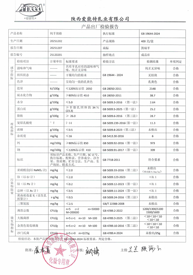 凯瑞羊纯羊奶粉400克2025年12月2日检验报告